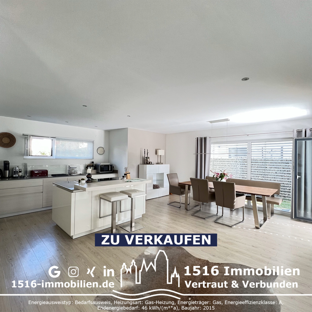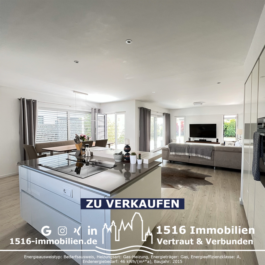 Der großzügig angelegte Eingangsbereich mit Diele und Gästetoilette führt in den offenen Koch-Ess-Loungebereich (ca.50m²) mit moderner Einbauküche und kleiner Speisekammer. Die bodentiefen Fenster und Türen sowohl zur Süd- als auch zur Westseite lassen den wunderbaren Wohn- und Essbereich in besonderer Helligkeit erstrahlen. Eine große Schiebetür führt hier zudem auf eine ca. 60m² große Terrasse in Süd-West-Ausrichtung und großzügigem Garten mit Rasenfläche.